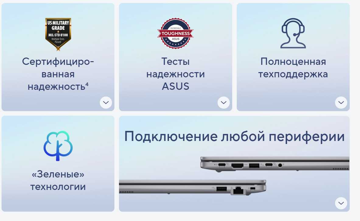 Ноутбук ExpertBook P1 соответствует военно-промышленному стандарту MIL-STD-810H4, что означает устойчивость к экстремальным условиям, таким как сильные колебания температуры, внезапные удары, резкие вибрации. Он также прошел строгие внутренние тесты ASUS, имитирующие эксплуатацию в реальных условиях. Усиленный экранный шарнир и прочные интерфейсные разъемы выдержат все тяготы активного использования в течение всего срока службы устройства, а прочный корпус без проблем перенесет случайные удары и падения. Такая высокая надежность сводит к минимуму техобслуживание, а значит компьютерное оборудование будет всегда работать с максимальной отдачей на благо вашей компании.