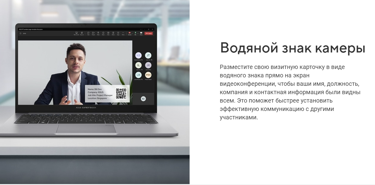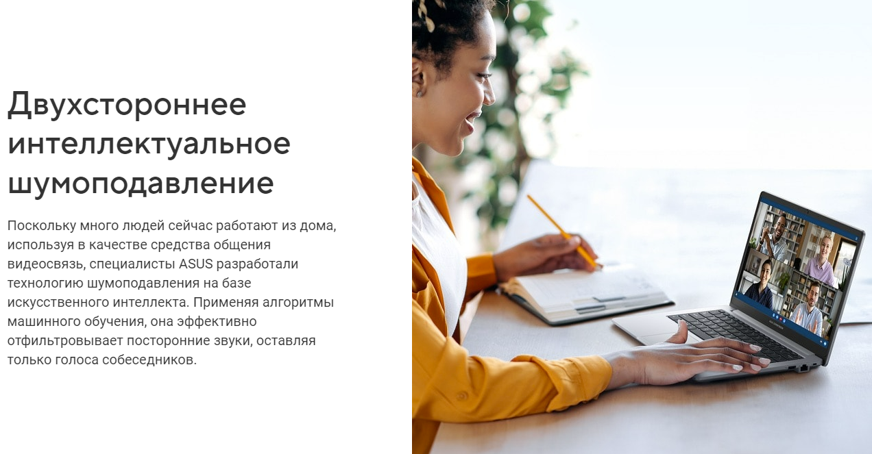 Поскольку много людей сейчас работают из дома, используя в качестве средства общения видеосвязь, специалисты ASUS разработали технологию шумоподавления на базе искусственного интеллекта. Применяя алгоритмы машинного обучения, она эффективно отфильтровывает посторонние звуки, оставляя только голоса собеседников.
