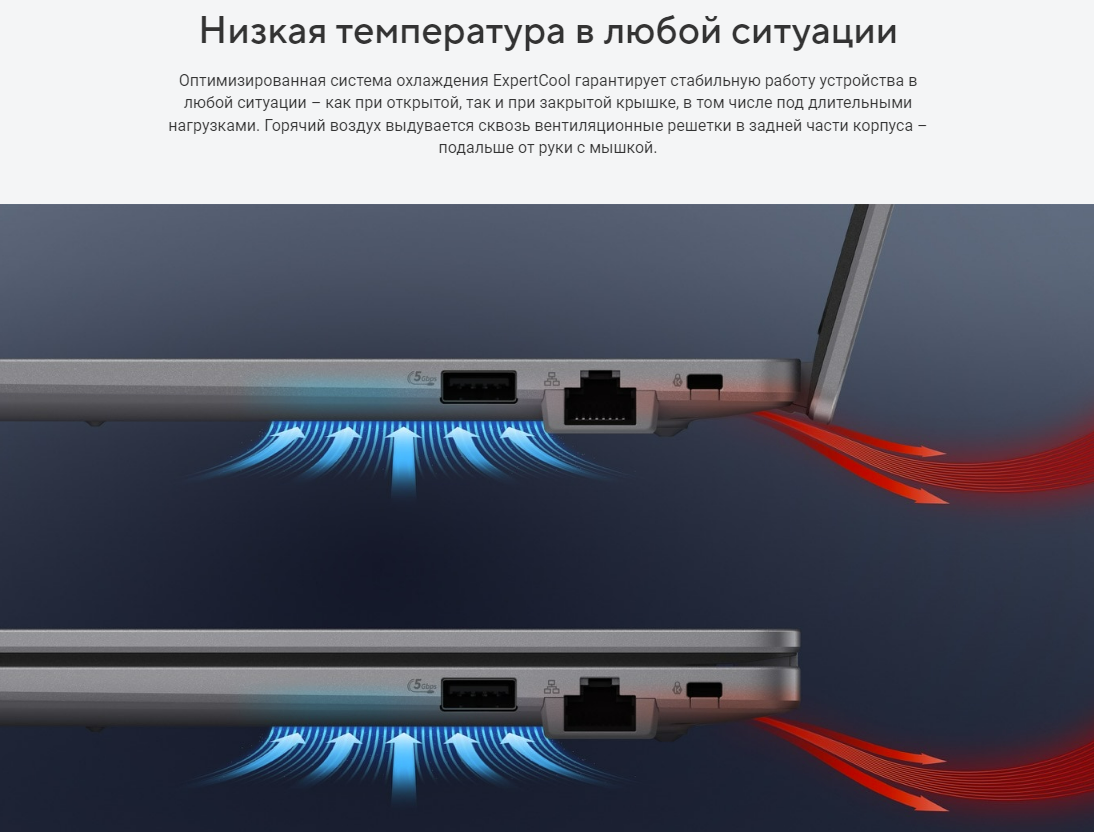 Оптимизированная система охлаждения ExpertCool гарантирует стабильную работу устройства в любой ситуации – как при открытой, так и при закрытой крышке, в том числе под длительными нагрузками. Горячий воздух выдувается сквозь вентиляционные решетки в задней части корпуса – подальше от руки с мышкой.