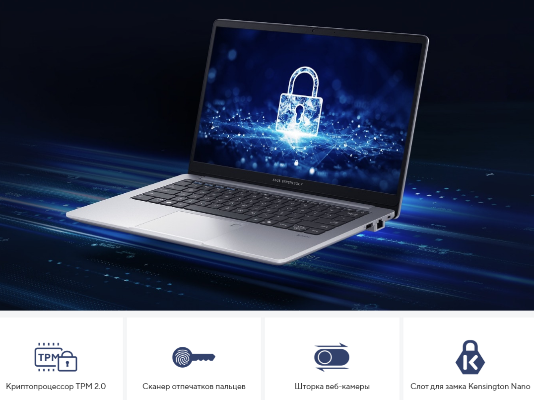 В ноутбуке ExpertBook P1 реализованы современные средства защиты конфиденциальных данных. Прошивка BIOS соответствует стандарту NIST SP 800-155. Аппаратный TPM-чип6 версии 2.0 служит для защищенного хранения аутентификационной информации (паролей и шифровальных ключей), которая используется приложениями при обращении с конфиденциальными данными и проведении транзакций. Веб-камера снабжена специальной шторкой, а для быстрой и безопасной аутентификации имеется сканер отпечатков пальцев.