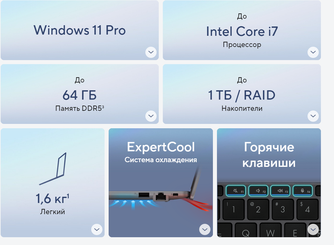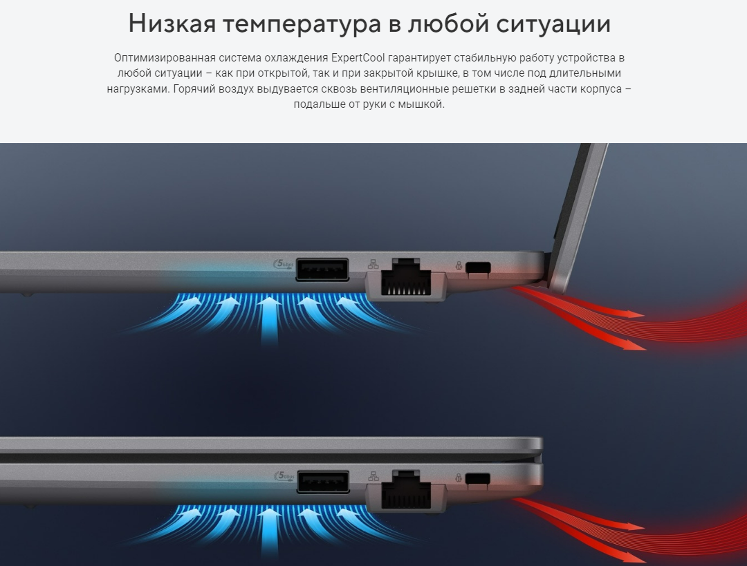 Оптимизированная система охлаждения ExpertCool гарантирует стабильную работу устройства в любой ситуации – как при открытой, так и при закрытой крышке, в том числе под длительными нагрузками. Горячий воздух выдувается сквозь вентиляционные решетки в задней части корпуса – подальше от руки с мышкой.