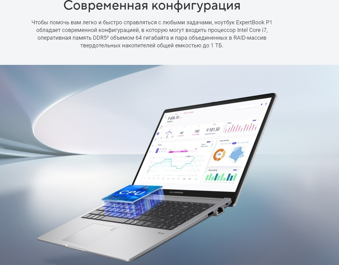 ASUS ExpertBook P1 – современный ноутбук для корпоративных пользователей. Дизайн ExpertBook P1 вдохновлен архитектурными идеями. Его корпус с элегантной отделкой серого цвета обладает невероятной легкостью. Вес устройства – от 1,6 кг.