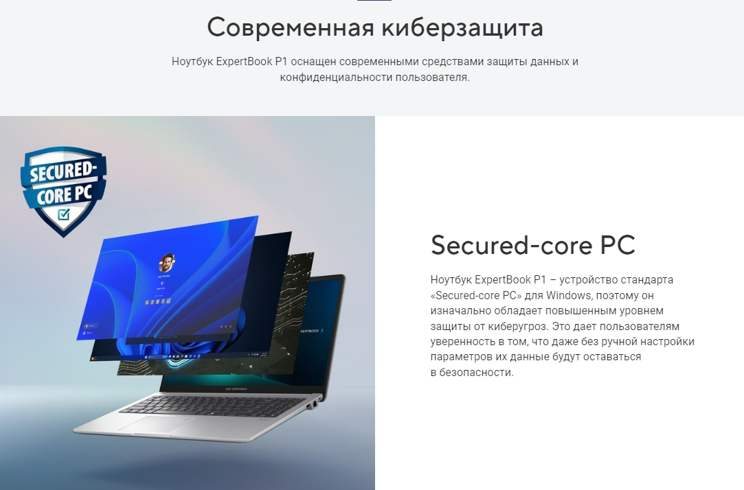 Ноутбук ExpertBook P1 – устройство стандарта «Secured-core PC» для Windows, поэтому он изначально обладает повышенным уровнем защиты от киберугроз. Это дает пользователям уверенность в том, что даже без ручной настройки параметров их данные будут оставаться в безопасности.