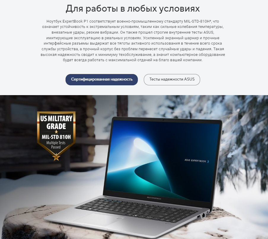 Ноутбук ExpertBook P1 соответствует военно-промышленному стандарту MIL-STD-810H4, что означает устойчивость к экстремальным условиям, таким как сильные колебания температуры, внезапные удары, резкие вибрации. Он также прошел строгие внутренние тесты ASUS, имитирующие эксплуатацию в реальных условиях. Усиленный экранный шарнир и прочные интерфейсные разъемы выдержат все тяготы активного использования в течение всего срока службы устройства, а прочный корпус без проблем перенесет случайные удары и падения. Такая высокая надежность сводит к минимуму техобслуживание, а значит компьютерное оборудование будет всегда работать с максимальной отдачей на благо вашей компании