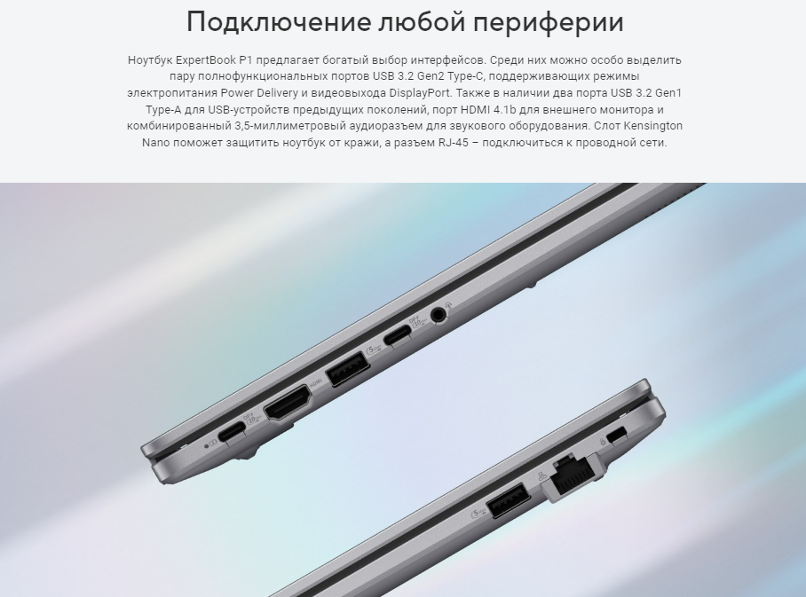 Ноутбук ExpertBook P1 предлагает богатый выбор интерфейсов. Среди них можно особо выделить пару полнофункциональных портов USB 3.2 Gen2 Type-C, поддерживающих режимы электропитания Power Delivery и видеовыхода DisplayPort. Также в наличии два порта USB 3.2 Gen1 Type-A для USB-устройств предыдущих поколений, порт HDMI 4.1b для внешнего монитора и комбинированный 3,5-миллиметровый аудиоразъем для звукового оборудования. Слот Kensington Nano поможет защитить ноутбук от кражи, а разъем RJ-45 – подключиться к проводной сети.